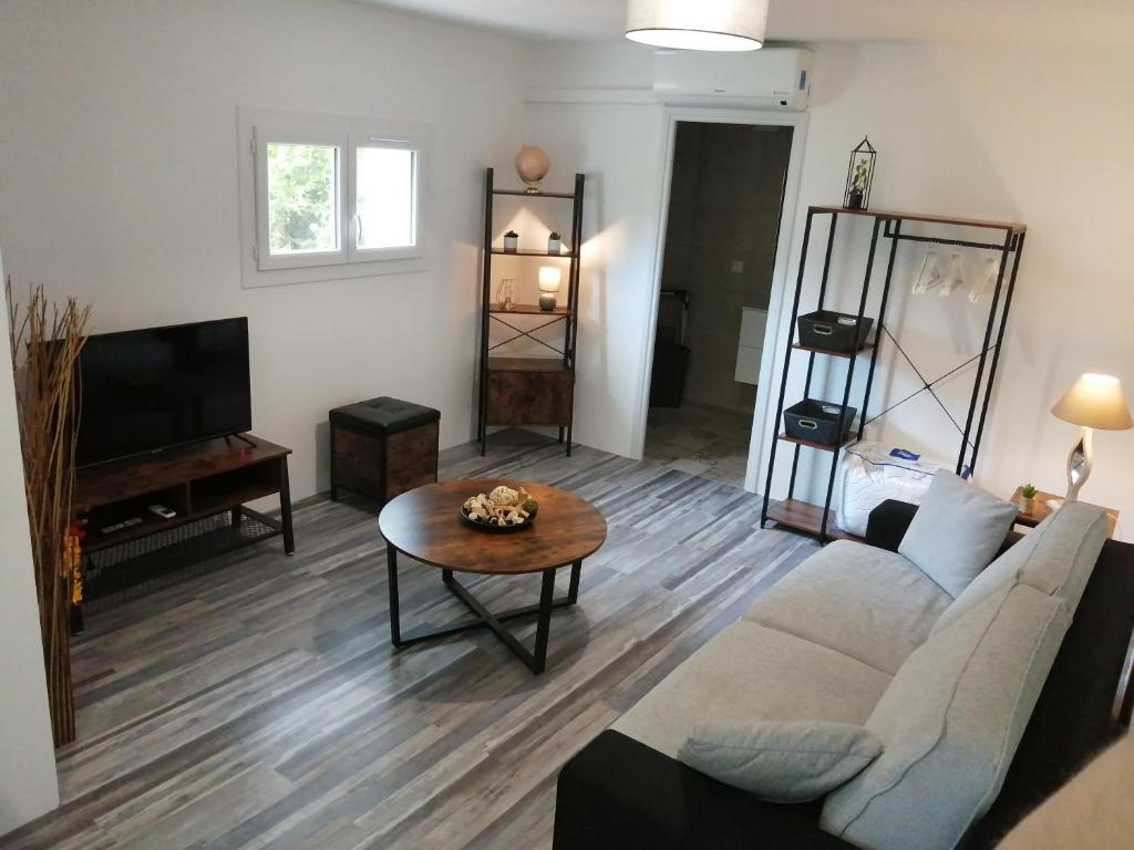 L'appartement totalement indépendant d'une superficie de 32 m² est composé d'une cuisine aménagée et équipée, climatisation réversible, salle d'eau avec douche XL, canapé convertible à usage quotidien (couchage 160 x 200), et le wi-fi gratuit via la fibre ; il dispose d'une terrasse privative ombragée et aménagée avec un espace repas ainsi que d'un emplacement de stationnement dans l'enceinte de la villa. Les motos peuvent stationner directement sur la terrasse principale et les vélos ont un coffre cadenassé à leur attention.